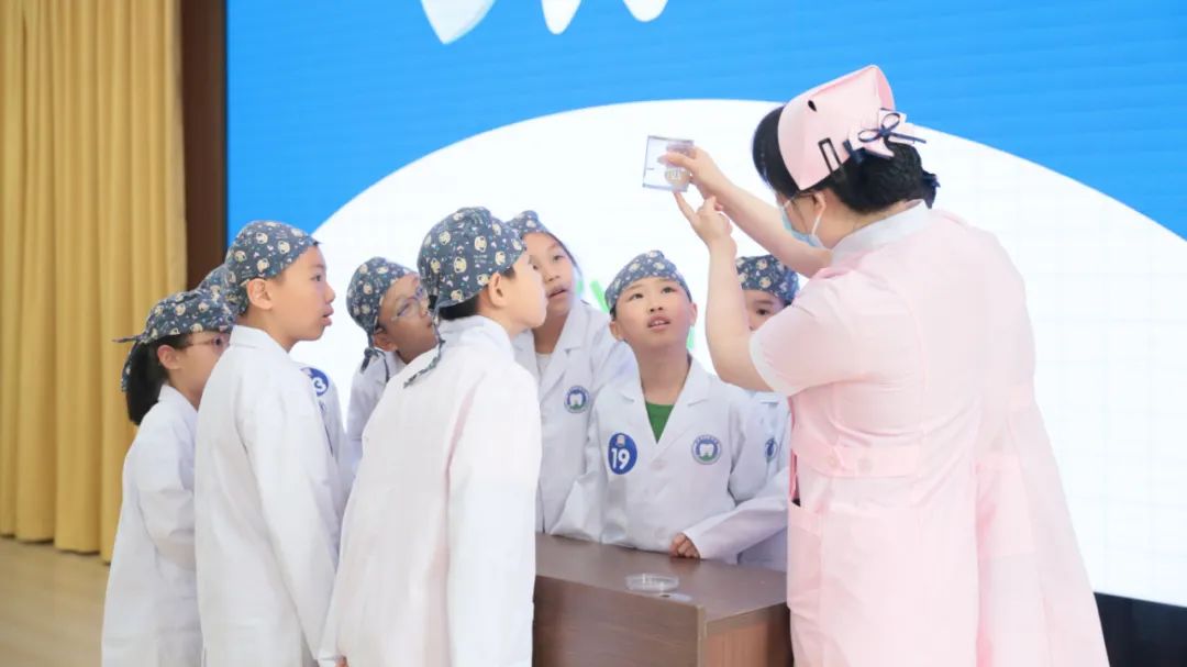 牙体牙髓病科唐敏敏医生首先以“白醋泡鸡蛋壳”的科学小实验拉开活动序幕,“白醋遇到鸡蛋壳会发生什么反应呢”,“我们口腔里面藏着哪些奥秘呢”,同学们的好奇心和求知欲瞬间被激发,唐医生用充满童趣的语言生动揭秘了牙齿的结构、作用、龋齿的危害、产生因素、预防措施,错颌畸形的危害,窝沟封闭的作用,牙外伤的应急处理,让同学们的口腔探索之旅加深了对口腔健康的理解和认识。