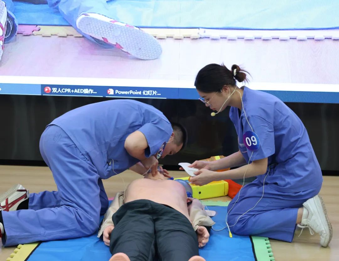 比赛现场气氛紧张有序。各参赛团队精神饱满、分工明确、反应迅速、配合默契。评委组依据操作规范、AED使用熟练度、按压深度与频率、有效通气质量及随机理论应答等多个维度进行严格评分。