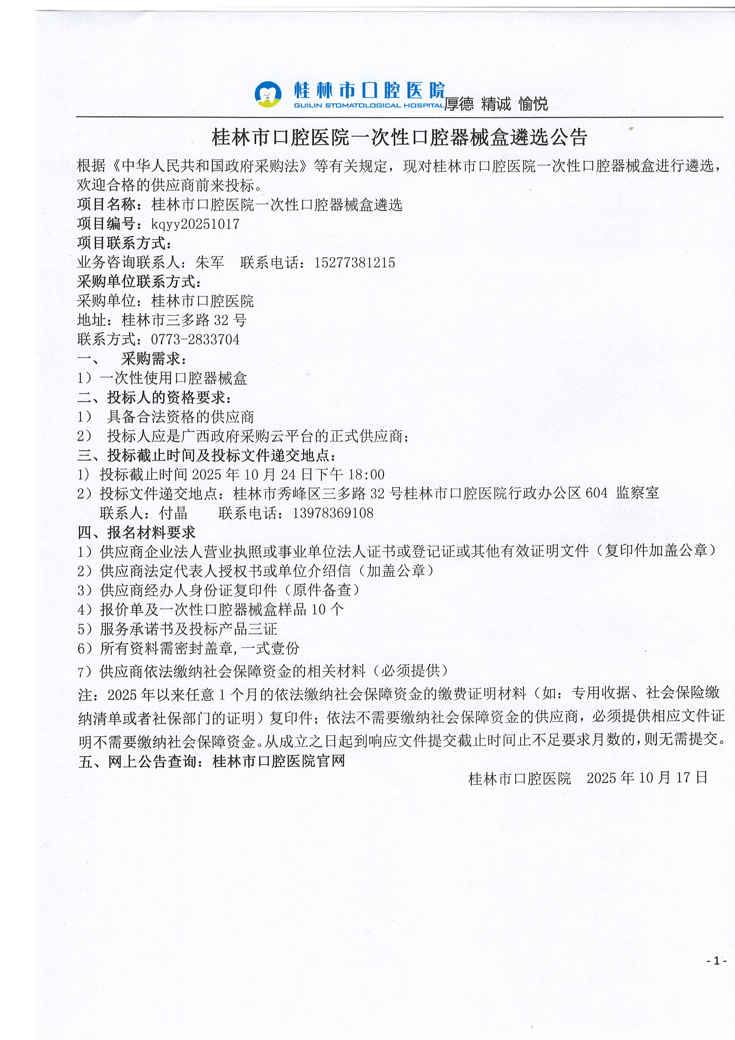 【桂林市口腔医院】二级专科医院,集医疗、教学、科研、预防保健于一体,肩负桂林市口腔疾病防治中心和桂林市牙病防治指导组办公室工作职能。